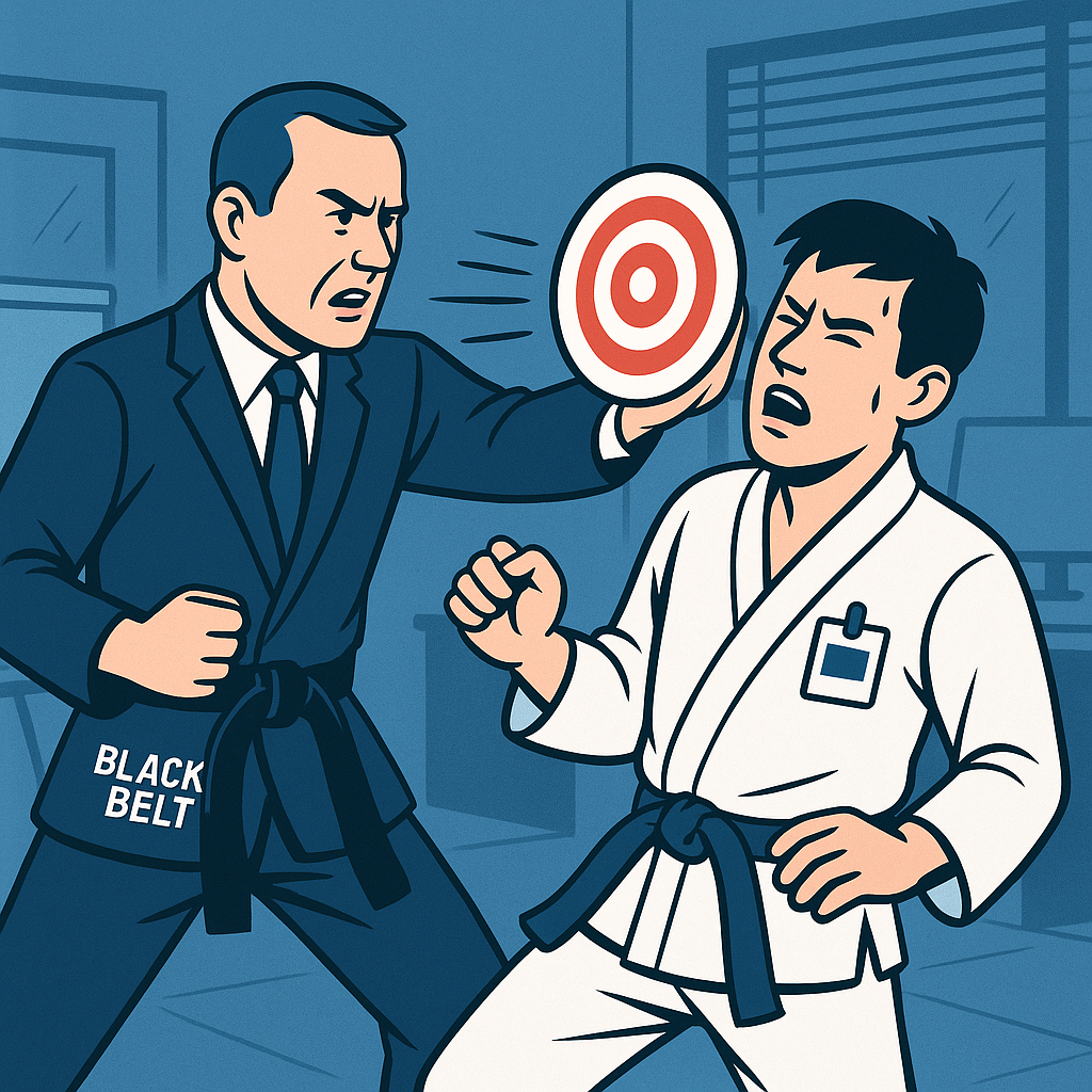 Toutes ceintures confondues, à la fin, vous pouvez finir à genoux. Pas pour méditer, juste pour ramasser les morceaux épars de votre mise à mort professionnelle et personnelle prochaines.