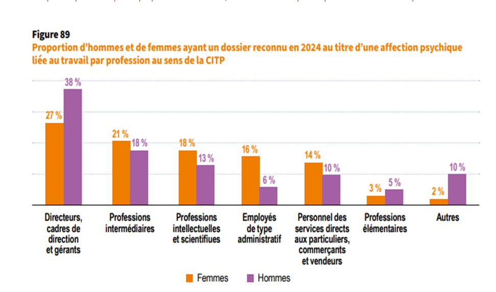 Vous pouvez constater sur ce graphique -extrait du document paru- que les Directeurs, Cadres de direction et gérants sont les plus ‘affectés’ psychiquement. Notre collectif a osé une extrapolation maison : « Soit les directions rendent fous ceux placés en dessous d'eux, harcèlement intégré en sus dans la culture managériale, ou alors leurs propres missions les étranglent. »